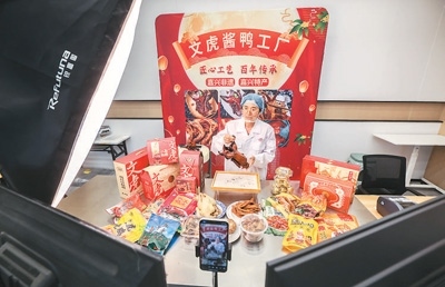 在浙江省嘉興市南湖區(qū)湘家蕩農(nóng)業(yè)加工園,老字號(hào)企業(yè)嘉興文虎醬鴨股份有限公司的直播間內(nèi),工作人員在直播銷售醬鴨。