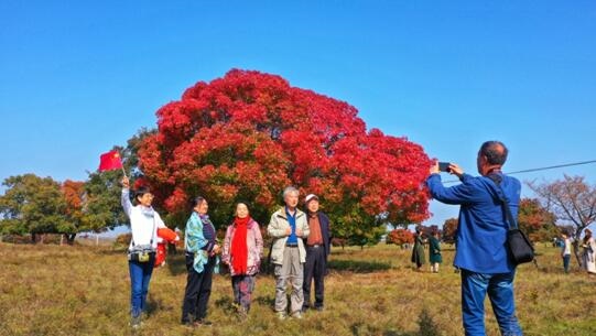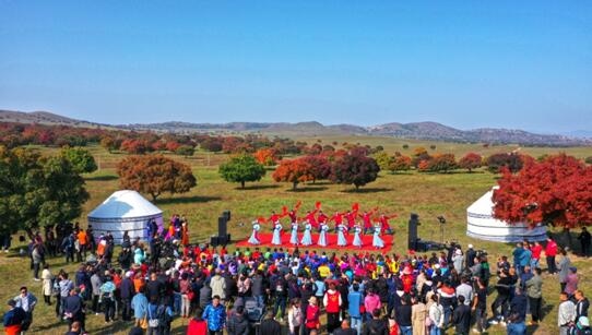 五角楓紅了,人們?cè)趤淼竭@里載歌載舞慶豐收。梁永峰 攝