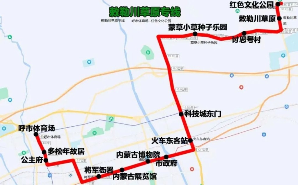 敕勒川草原專線(呼市體育場(chǎng)——紅色文化公園)途經(jīng):氣象局西巷、海拉爾西街、呼倫南路、新華大街、新華東街、科爾沁北路輔道、呼和塔拉西街、呼和塔拉東街、野馬圖、Y371。沿途設(shè)站:呼市體育場(chǎng)、多松年故居、公主府、將軍衙署、內(nèi)蒙古展覽館、內(nèi)蒙古博物院、市政府、火車東客站、科技城東門、蒙草小草種子樂園、討思號(hào)村、敕勒川草原、紅色文化公園,單程:30.5公里,配車:8—10臺(tái)。