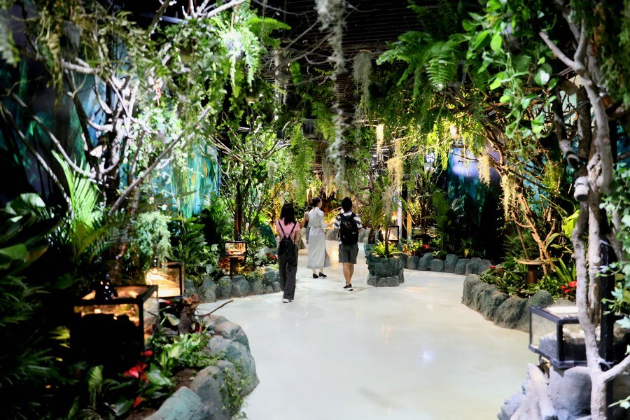 此次展覽主要以實(shí)景植物造景、活體動(dòng)物和圖文展板相結(jié)合的方式進(jìn)行展示。其中活體動(dòng)物有30多種約300只,包括鸚鵡、守宮、蛇、蜥蜴等鳥類和爬行類動(dòng)物。