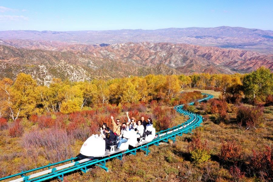 9月26日,游客乘坐小火車游玩固陽(yáng)馬鞍山
