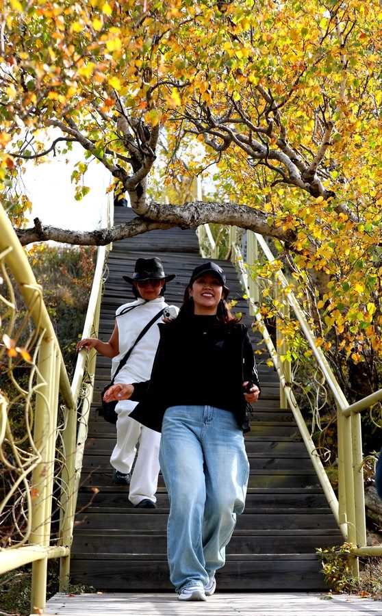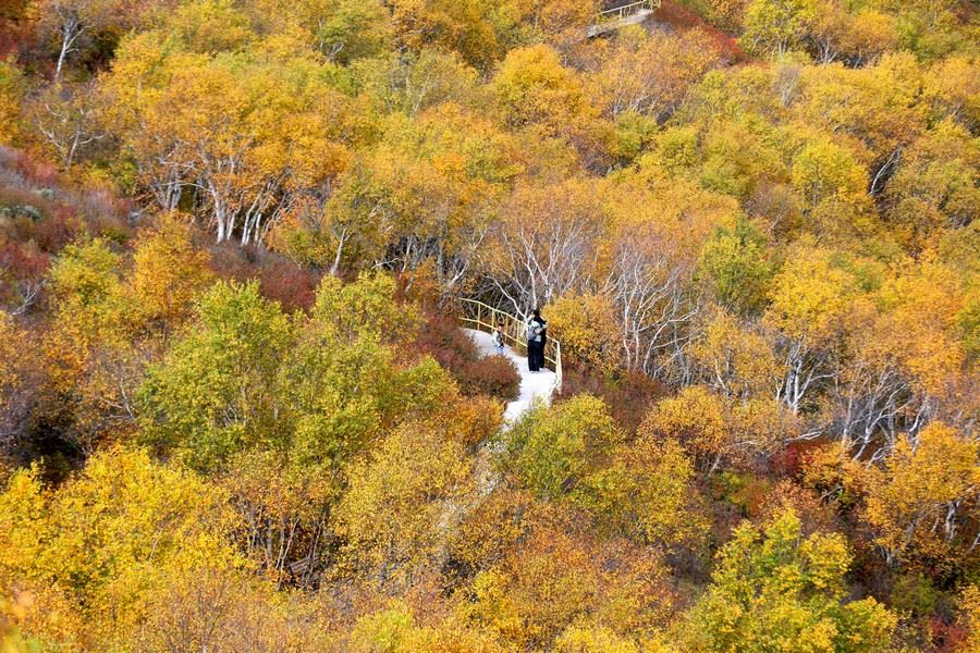 9月26日,游客在一片金黃的固陽(yáng)馬鞍山游玩