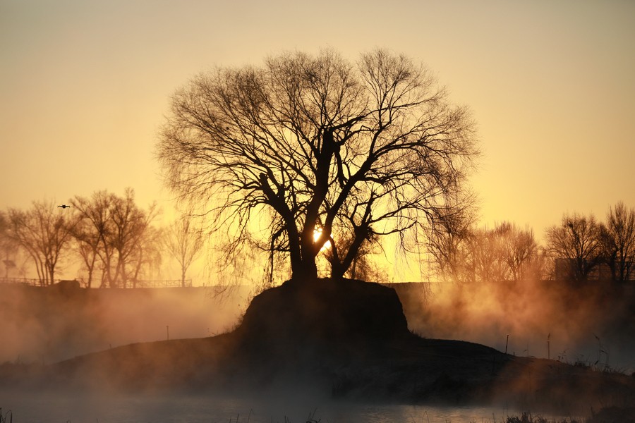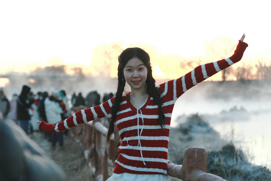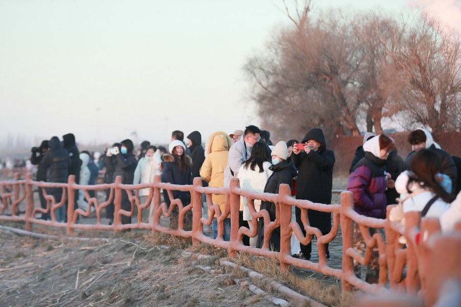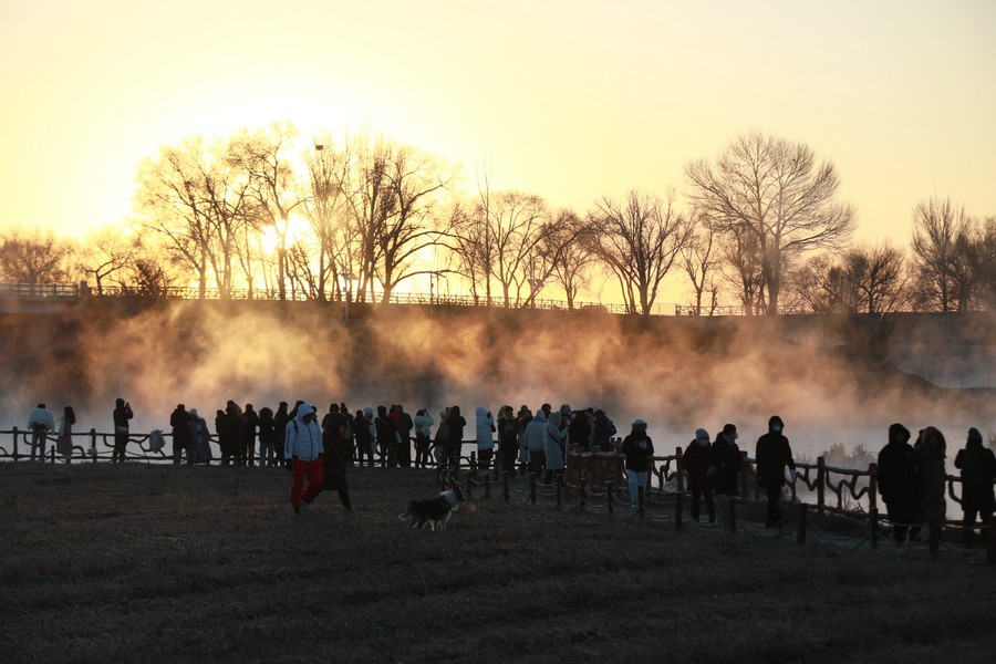 12月15日清晨,上千名游人在呼和浩特玉泉區(qū)班定營(yíng)村南側(cè)的塞外“千島湖”畔賞景打卡。此處湖水為城市污水經(jīng)處理達(dá)標(biāo)后的再生水,隆冬時(shí)節(jié),再生水流入湖中,水汽蒸騰,岸邊草木霧凇皚皚,良好的生態(tài)吸引了數(shù)萬只赤麻鴨在此翔集棲息,構(gòu)成一幅生動(dòng)和諧的美麗畫面。每日清晨,都有上千名游客來此觀日出賞美景。