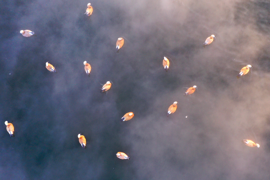 12月15日,上萬只赤麻鴨在塞外“千島湖”棲息游弋