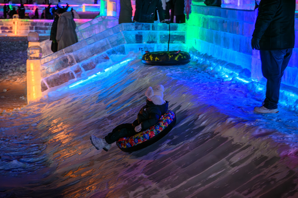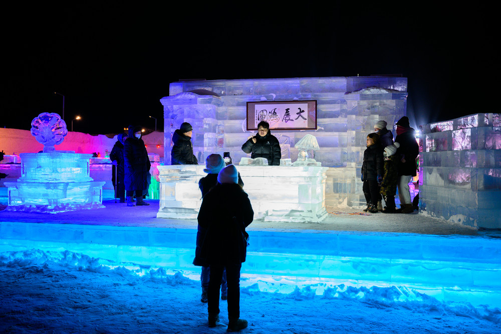 園區(qū)內(nèi)更是熱鬧非凡。中式“北國第一門”、俄式童話城堡、蒙式游牧風情三大特色入口,成了游客打卡的首選地。258米長的中式主題雪墻鋪展著“萬里茶道”的傳奇故事,復(fù)古火車站、蒸汽機車雪雕復(fù)刻著中東鐵路的舊時光,隨手一拍都是自帶氛圍感的大片。冰雪滑梯、雪地碰碰球等十余項娛樂項目前排起了長隊,大人小孩都玩得不亦樂乎;蒙古包暖屋里,熱氣騰騰的奶茶、鮮燉烤梨香氣四溢,暖心又暖胃。科技感拉滿了游玩體驗,不少游客拿著手機掃碼體驗語言冰書冰墻,中俄蒙常用語一學就會,還有炫彩音樂噴泉冰柱打造互動琴鍵裝置,時光之門光幕呈現(xiàn)科幻特效。