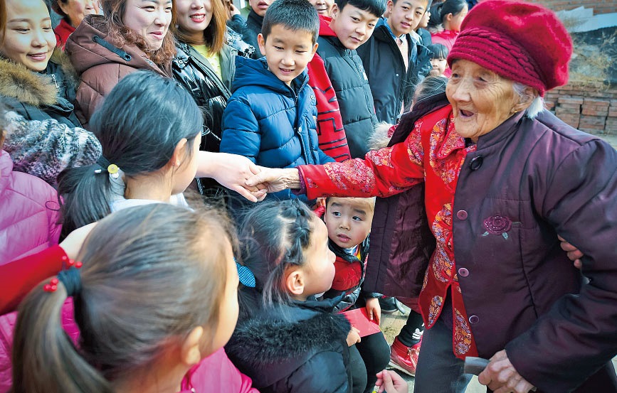 老人的兒孫們?nèi)缃翊蠖喽荚谕鈱W習、工作、做生意,大家族的成員日子都過得紅紅火火。對于老人來說,子孫滿堂是最幸福的事;對于孩子們來說,老人健康長壽,也是他們最大的愿望。五世同堂,98口人,百歲老人賈先女露出幸福的笑容。