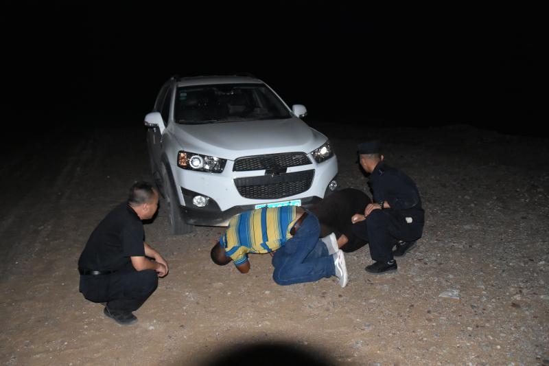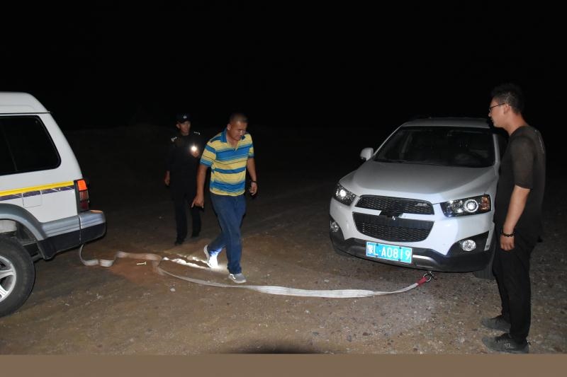 正當(dāng)二人漸漸失去希望的時候,當(dāng)晚10點(diǎn)10分,遠(yuǎn)處一道燈光閃過,原來,阿拉善邊境管理支隊(duì)溫圖高勒邊境派出所民警下鄉(xiāng)走訪正好路過。得知二人情況后,民警立即展開救援,一路迅速找出隨身攜帶的干糧、礦泉水為二人補(bǔ)充體力,一路找出牽引繩對被困車輛開展救援,經(jīng)過6個小時的拖拽,終于在凌晨4點(diǎn)將兩名群眾安全帶到了派出所。