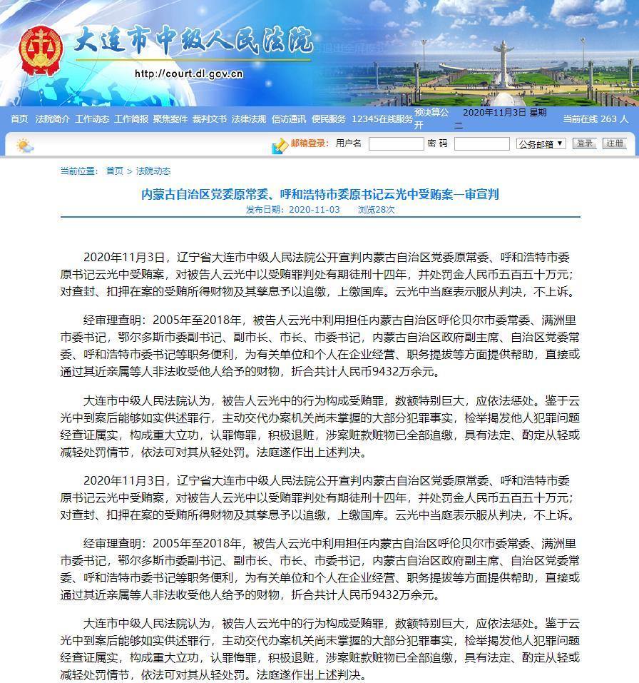2020年11月3日,遼寧省大連市中級人民法院公開宣判內蒙古自治區(qū)黨委原常委、呼和浩特市委原書記云光中受賄案,對被告人云光中以受賄罪判處有期徒刑十四年,并處罰金人民幣五百五十萬元;對查封、扣押在案的受賄所得財物及其孳息予以追繳,上繳國庫。云光中當庭表示服從判決,不上訴。