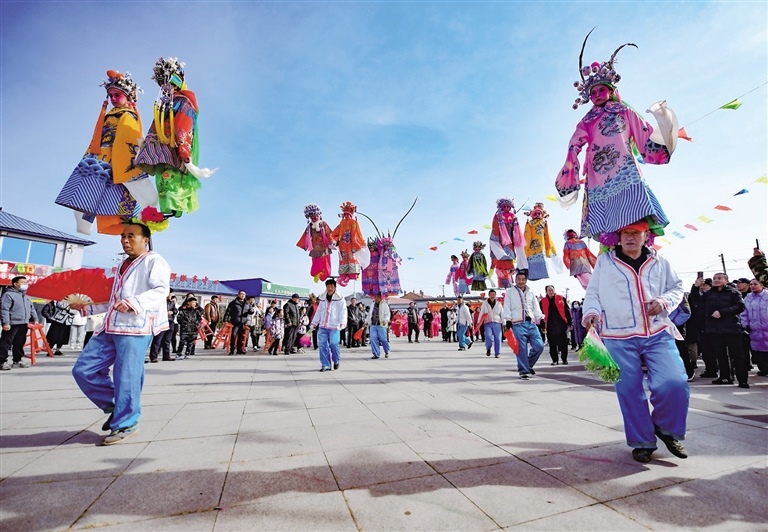 2月14日,在呼和浩特市土左旗畢克齊鎮(zhèn)臘鋪村文化廣場上,秧歌扭起來,鑼鼓敲起來,腦閣也款款擺起來。腦閣是國家級非物質文化遺產(chǎn),扛閣的人在行走中踏著鼓點,通過身體搖動帶動架子上的孩子擺起來,極具觀賞性。(記者 鄭學良 通訊員 楊鑫 )