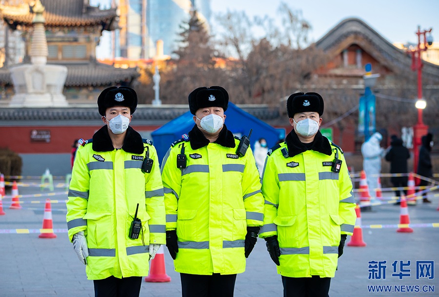 2月21日,在呼和浩特市玉泉區(qū)小召街道五塔寺廣場臨時核酸采樣點(diǎn),玉泉交管大隊民警在執(zhí)勤。新華網(wǎng)發(fā) (丁根厚 攝)