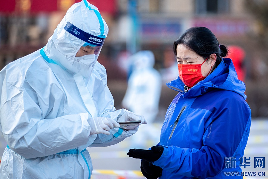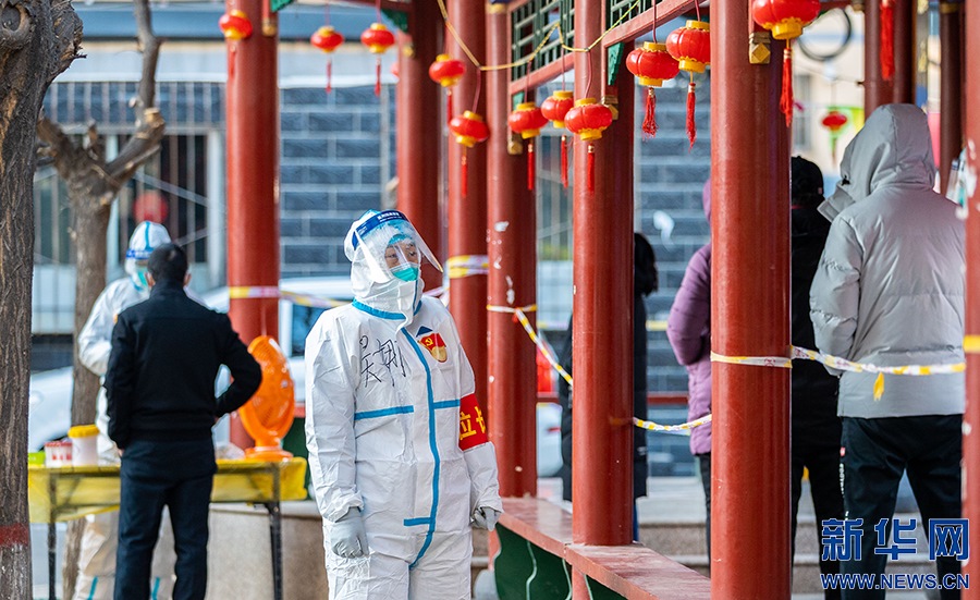 2月21日,在呼和浩特市玉泉區(qū)興隆巷街道芳清園小區(qū)臨時核酸采樣點(diǎn),點(diǎn)位長在核酸采樣現(xiàn)場工作。新華網(wǎng)發(fā) (丁根厚 攝)