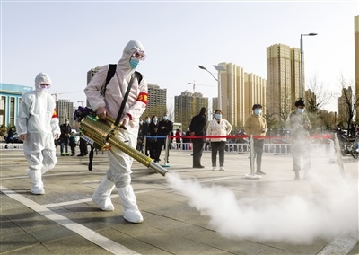 志愿者對戶外通道進行消殺