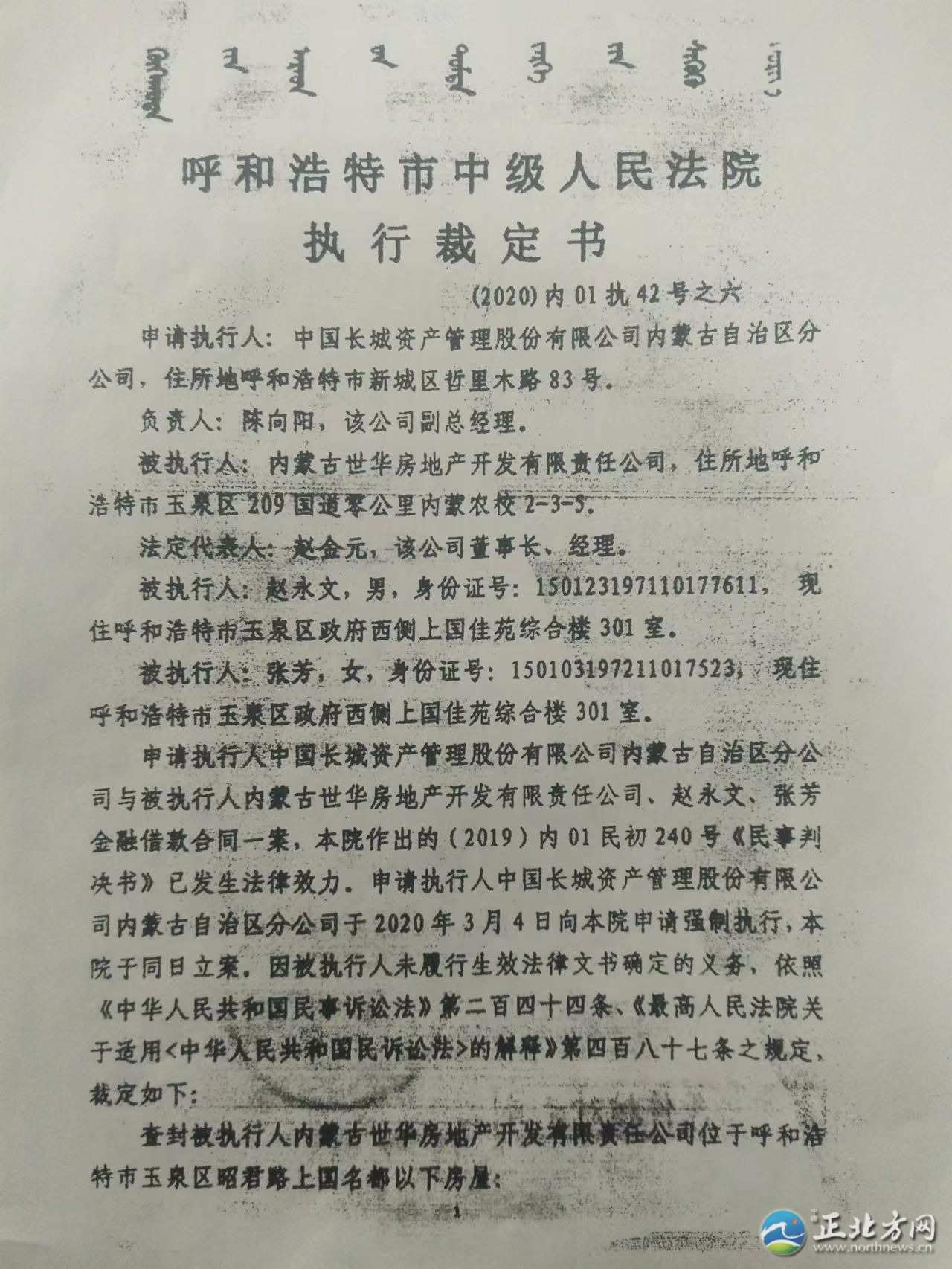 記者從上國名都部分業(yè)主提供的法院執(zhí)行裁定書上了解到,僅中國長城資產(chǎn)管理股份有限公司內(nèi)蒙古自治區(qū)分公司一家申請(qǐng)執(zhí)行人就申請(qǐng)法院查封了上國名都住宅樓80多套房產(chǎn)。其他債權(quán)人又通過多家法院查封了上國名都小區(qū)60多套住宅。目前,上國名都216套住宅有140多套被查封。