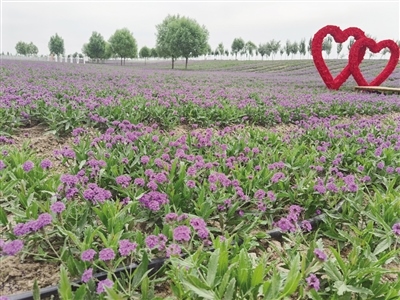 8月23日,記者來到馬鞭草花海,遠(yuǎn)遠(yuǎn)望去,遍野的紫色在視線中彌漫開來,叫人情不自禁奔向花海。微風(fēng)拂過,花枝搖曳,心形造型、大風(fēng)車、馬頭琴等景觀小品點綴其間,給花海增添了一份浪漫情調(diào)。人們沿著