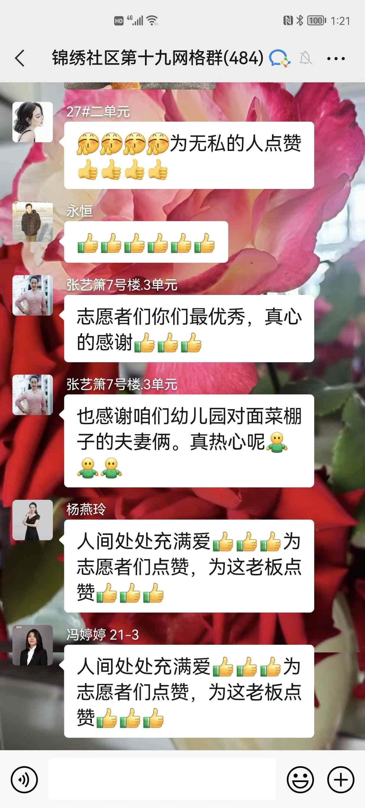 “10元、20元、30元、50元、100元……”10月28日晚,在錦繡社區(qū)第十九網(wǎng)格群,業(yè)主的捐款紛至沓來,短短4個小時籌款近萬元。原來,由于景觀花園小區(qū)物業(yè)原有的消殺工作人員肌肉拉傷,消殺速度遠(yuǎn)遠(yuǎn)達(dá)不到預(yù)期,業(yè)主楊博鵬便在群里發(fā)出組建一支消殺志愿者團(tuán)隊的倡議,號召業(yè)主們捐款購買專業(yè)消殺彌霧機(jī)和藥品。沒想到倡議得到了廣大業(yè)主的一致響應(yīng),“我報名!”“我也報名,躺著也是躺著,不如干點有意義的事!”網(wǎng)格群里沸騰起來,大家紛紛解囊相助,張富、斯琴吐、薛國清、崔占、史永生等15位業(yè)主還踴躍報名參加消殺志愿者團(tuán)隊。