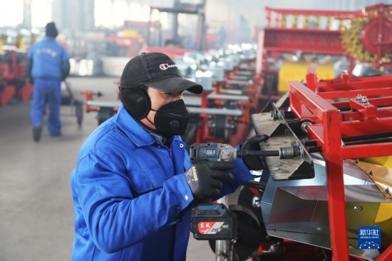 2月16日,在甘肅省定西市一家農(nóng)機(jī)制造企業(yè),工人在組裝農(nóng)機(jī)。