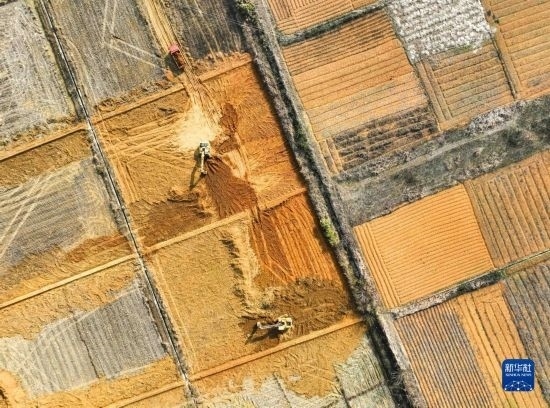 2月16日,在湖南省永州市道縣壽雁鎮(zhèn)芽洞村,工人駕駛挖掘機(jī)在高標(biāo)準(zhǔn)農(nóng)田建設(shè)項(xiàng)目現(xiàn)場施工(無人機(jī)照片)。
