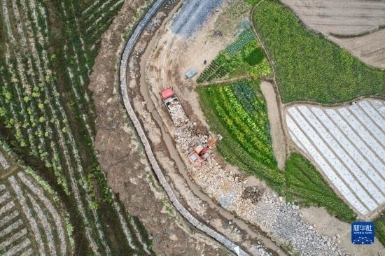 2月16日,在浙江省臺州市仙居縣雙廟鄉(xiāng),工人在水渠及機(jī)耕道路施工現(xiàn)場施工(無人機(jī)照片)。
