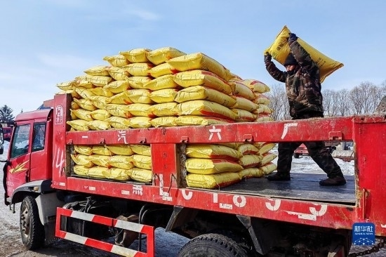 2月16日,北大荒集團(tuán)五大連池農(nóng)場科技服務(wù)中心工人在裝運(yùn)肥料。