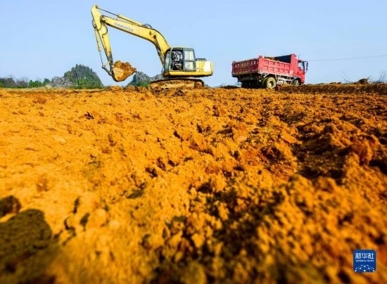 2月16日,在湖南省永州市道縣壽雁鎮(zhèn)芽洞村,工人駕駛挖掘機(jī)在高標(biāo)準(zhǔn)農(nóng)田建設(shè)項(xiàng)目現(xiàn)場施工。