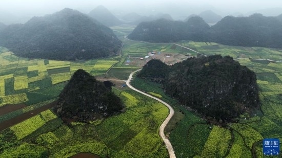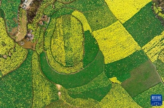 2月17日拍攝的貴州省六盤水市六枝特區(qū)木崗鎮(zhèn)萬(wàn)畝油菜基地(無(wú)人機(jī)照片)。
