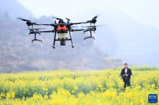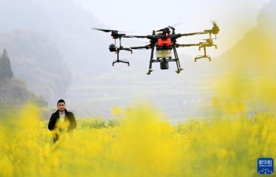 2月17日,在貴州省六盤水市六枝特區(qū)木崗鎮(zhèn)油菜基地,農(nóng)技人員利用植保無(wú)人機(jī)進(jìn)行春管。