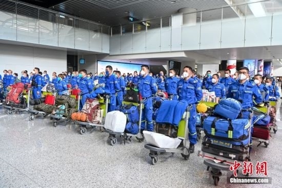 2月19日,廣東省廣州市,藍(lán)天救援隊赴土耳其隊員抵達(dá)廣州白云機(jī)場。當(dāng)日,100余名藍(lán)天救援隊赴土耳其隊員搭乘CZ8066航班返抵廣州。中新社記者 陳驥旻 攝