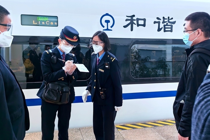 云縣站工作人員引導(dǎo)醫(yī)務(wù)人員進入站臺乘坐動車。中國鐵路昆明局集團有限公司供圖