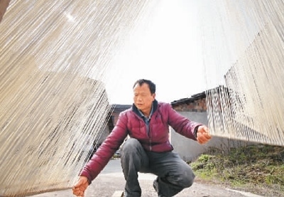 2月16日,江西省撫州市金溪縣滸灣鎮(zhèn)老街區(qū),油面師傅在晾曬老字號(hào)食品滸灣油面。 鄧興東攝(人民視覺)
