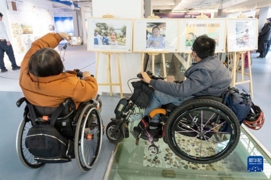 2月22日,肢殘人士乘著輪椅參觀“融合無障愛、攜手向未來”殘障融合主題兒童青少年攝影作品巡展。