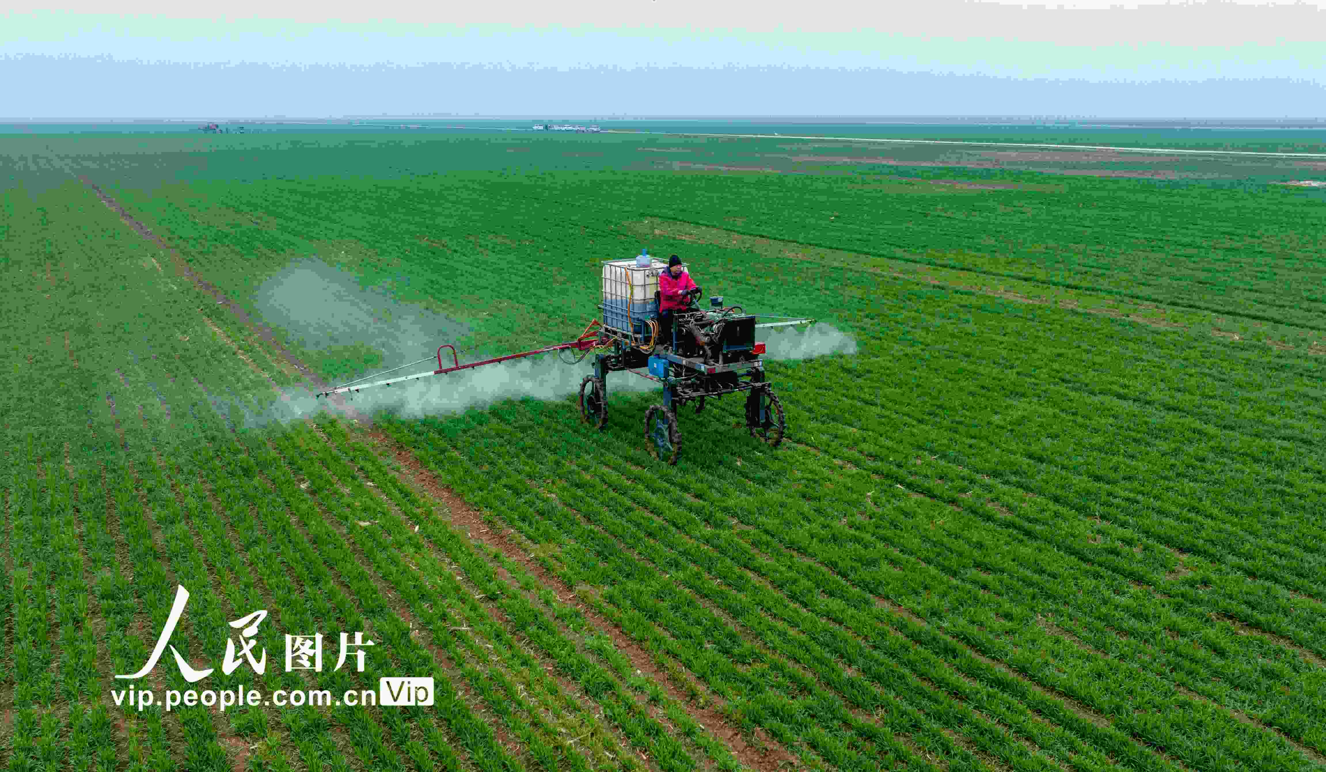 2023年2月25日,河南省駐馬店市西平縣老王坡高標(biāo)準(zhǔn)農(nóng)田,農(nóng)民正在駕駛農(nóng)機(jī)設(shè)備噴灑農(nóng)藥。趙永濤攝(人民圖片網(wǎng))