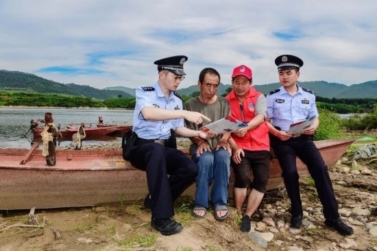 圖為移民管理警察王鐵映開展?jié)O船民管理宣傳工作。