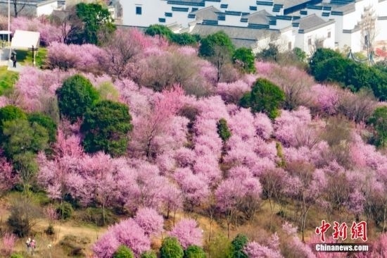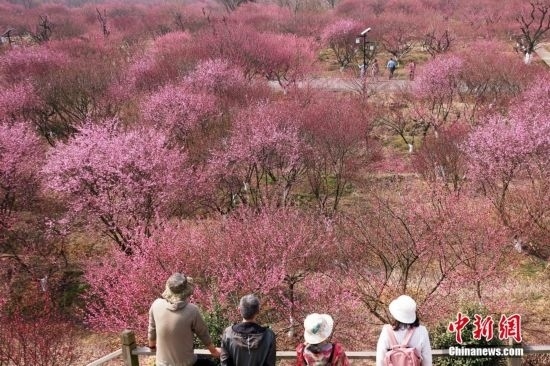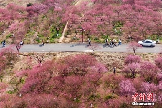 3月9日,江蘇南京,郊外盛開的梅花接連成片,呈現(xiàn)“粉色海洋”。中新社記者 泱波 攝