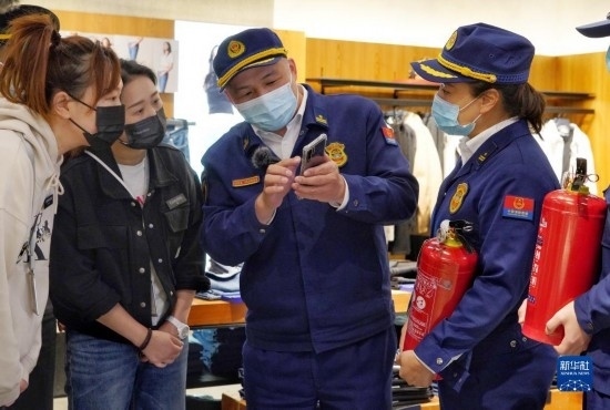 3月14日,消防支隊(duì)防火監(jiān)督員(中)為商場(chǎng)商戶講解如何使用手機(jī)掃碼方式辨別消防產(chǎn)品真?zhèn)巍?/p>