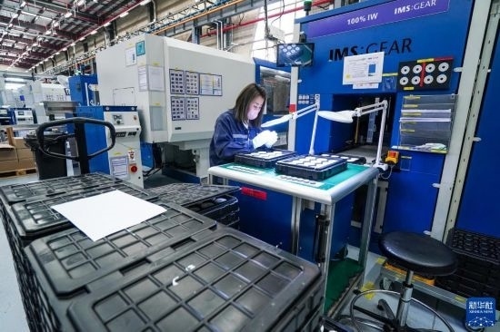 工人在位于太倉(cāng)市高新區(qū)的威爾斯新材料(太倉(cāng))有限公司生產(chǎn)車間內(nèi)進(jìn)行加工作業(yè)(3月16日攝)。