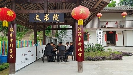 忠縣法院法官在鄉(xiāng)村振興法治工作站調解糾紛。