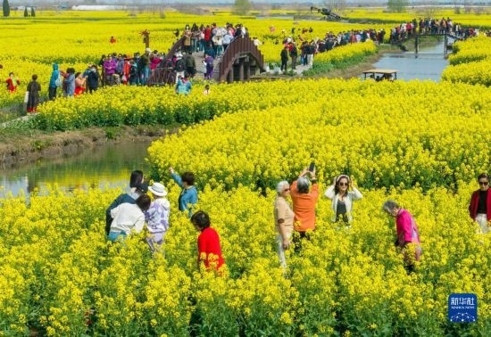 近日,江蘇興化千垛菜花風景區(qū)溝河交錯圍成的垛田上,油菜花次第開放,吸引人們前來踏青賞花。