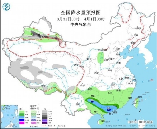 3月30日08時至31日08時,新疆沿天山地區(qū)、西藏東部和南部、川西高原南部、青海東北部、甘肅東部等地部分地區(qū)有小到中雪或雨夾雪,其中,新疆沿天山等地部分地區(qū)有大雪(5~8毫米);新疆伊犁河谷、西藏東南部、西北地區(qū)東北部、四川東南部、重慶南部、貴州、云南東部、湖南南部、江西中南部、浙江、福建、廣西、廣東、海南島等地部分地區(qū)有小到中雨。新疆北部、內(nèi)蒙古中部、黑龍江東部、遼東半島等地部分地區(qū)有4~6級風(fēng)(見圖1)。東海大部海域有5~7級風(fēng),陣風(fēng)8級。