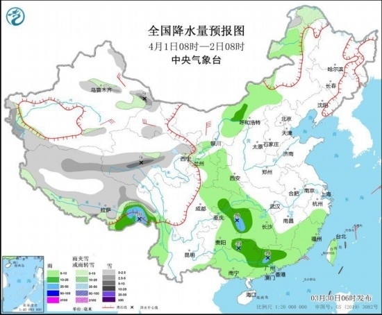 圖1 全國降水量預(yù)報圖(3月30日08時-31日08時)