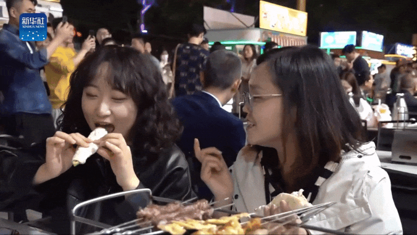 4月14日晚,新華社記者正在進行“沉浸式打卡淄博燒烤”直播。圖為直播畫面動圖。