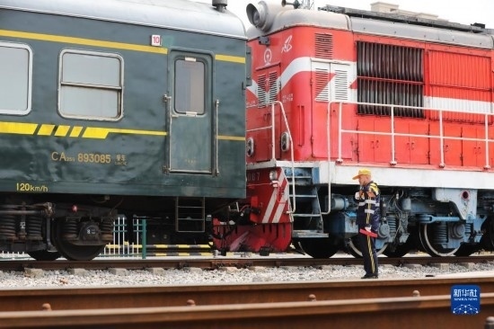 4月28日,中國鐵路上海局集團有限公司徐州站的鐵路連結(jié)員在進行單機連掛車輛作業(yè)。