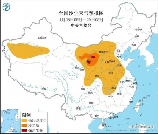 受冷空氣大風影響,預(yù)計4月28日08時至29日08時,新疆南部、內(nèi)蒙古中西部、甘肅北部和東部、寧夏、陜西、四川盆地北部、山西、河北西部、河南、山東中西部、湖北、湖南北部、安徽北部、江蘇西北部等地的部分地區(qū)有揚沙或浮塵天氣,其中,內(nèi)蒙古西南部、甘肅東北部、寧夏中北部、陜西西北部等地的部分地區(qū)有沙塵暴,局地有強沙塵暴。中央氣象臺4月28日06時發(fā)布沙塵暴藍色預(yù)警。