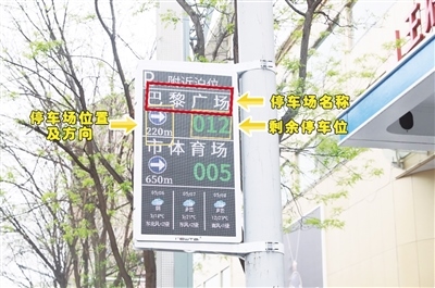 5月7日上午,在中山西路,記者看到懸掛的智能停車指引屏上顯示附近停車場的位置,以及停車場的停車位余量。維多利購物中心附近的一個智能停車指引屏上顯示民族大世界有7個空余停車位、民族商場有18個空余停車位,而這些數(shù)據(jù)也在實時更新,市民根據(jù)智能停車指引屏的信息便能輕松找到停車位,不用再為停車難而發(fā)愁。