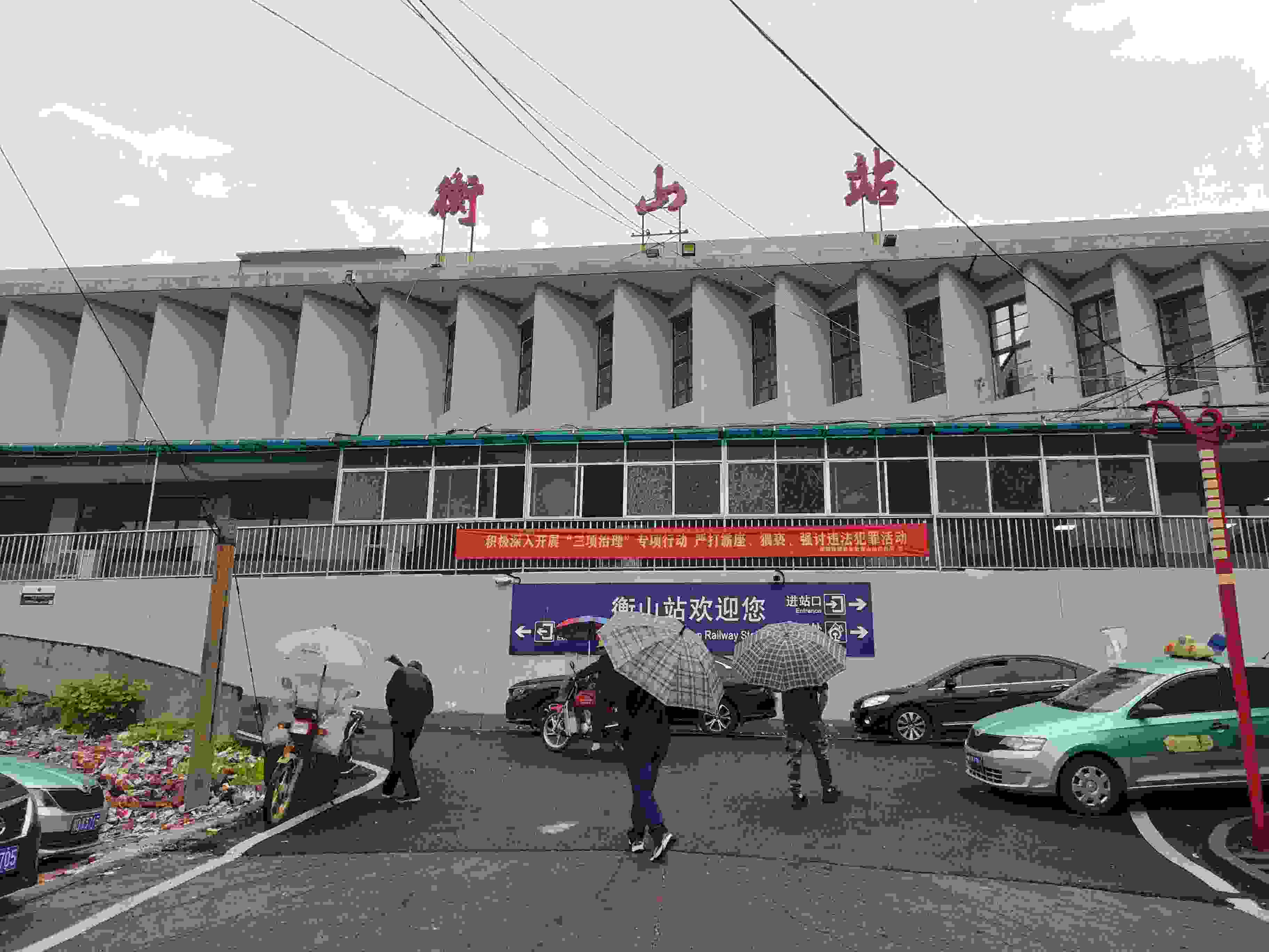 長條形的兩層車站大樓位于一處小坡上,外墻灰白色。透過水泥桿上掛設(shè)的零亂電線,便可看見大樓上方三個(gè)紅色大字——衡山站。