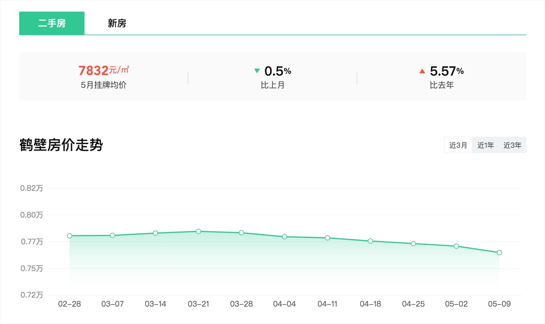 從安居客平臺(tái)上可以看到,5月,鶴壁整體的二手房掛牌均價(jià)為7832元/平方米,環(huán)比下跌0.5%,同比上漲5.57%。下轄的5個(gè)行政區(qū)的房?jī)r(jià)差異則較大。其中,鶴壁新區(qū)淇濱區(qū)二手房掛牌均價(jià)為7565元/平方米,環(huán)比下跌0.68%,同比上漲3.49%;而老城區(qū)山城區(qū)二手房的掛牌價(jià)僅顯示1465元/平方米。
