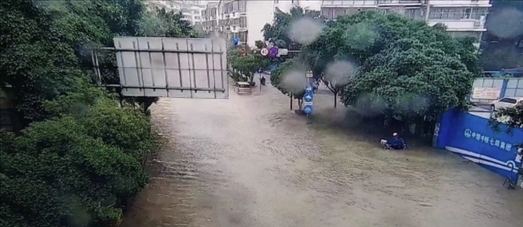 暴雨過后,城市道路積水嚴(yán)重,城區(qū)出現(xiàn)內(nèi)澇,市民蹚水出行。