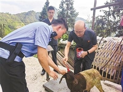 圖②:執(zhí)行干警對稱重后的山羊進行標記。