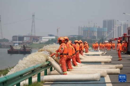 6月2日,在水域救援實戰(zhàn)演習現(xiàn)場,消防救援人員在湘江邊模擬內(nèi)澇排水。