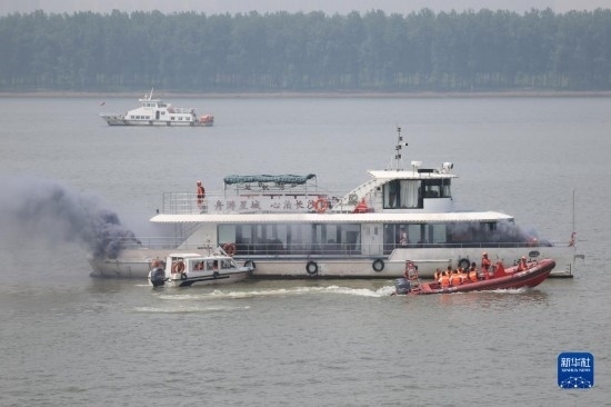 6月2日,在水域救援實戰(zhàn)演習現(xiàn)場,消防救援人員駕駛消防艇在模擬水上滅火行動(無人機照片)。