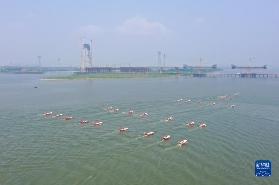 這是6月2日在水域救援實戰(zhàn)演習現(xiàn)場拍攝的消防舟艇編隊(無人機照片)。